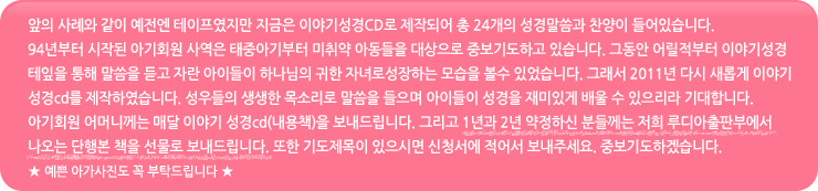 루디아어린이선교회의 태중아기를 위한 테이프를 소개하 주신 권사님께 감사를 드리며 어린 지연이에게 일찍이 말씀과 찬양에 은혜를 주신 하나님께 영광과 감사를 드린다.